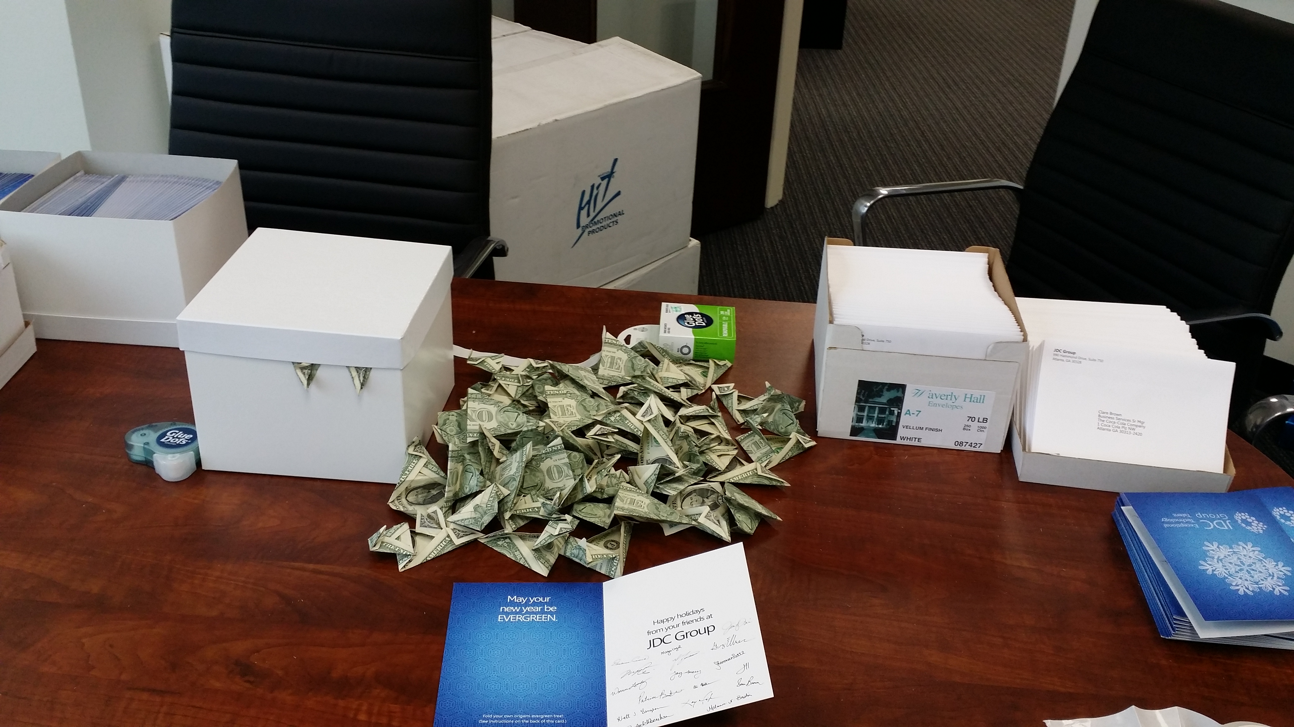 She worked with an external company to design and print an attractive custom holiday card. It incorporated the company brand and had signatures from the whole staff printed inside. However, the most unique feature of the card was inclusion of an origami tree folded from a one dollar bill with instructions on the back so receivers could recreate the tree.